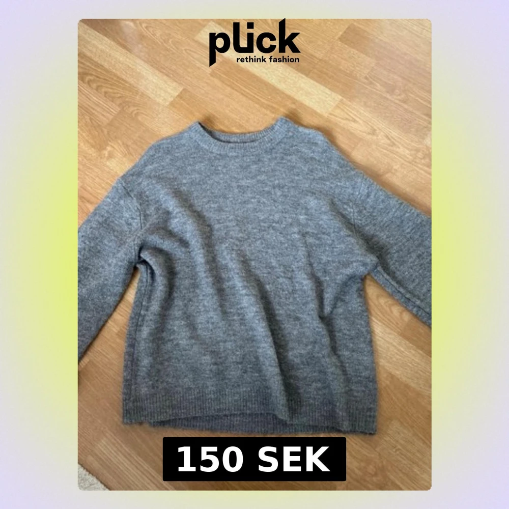 Mysig grå stickad tröja med rund hals och långa ärmar. Tröjan har en enkel, rak passform och ribbade muddar vid hals, ärmslut och nederkant. Perfekt för lager på lager och höstmys. Materialet känns mjukt och värmande, troligen en ullblandning.
