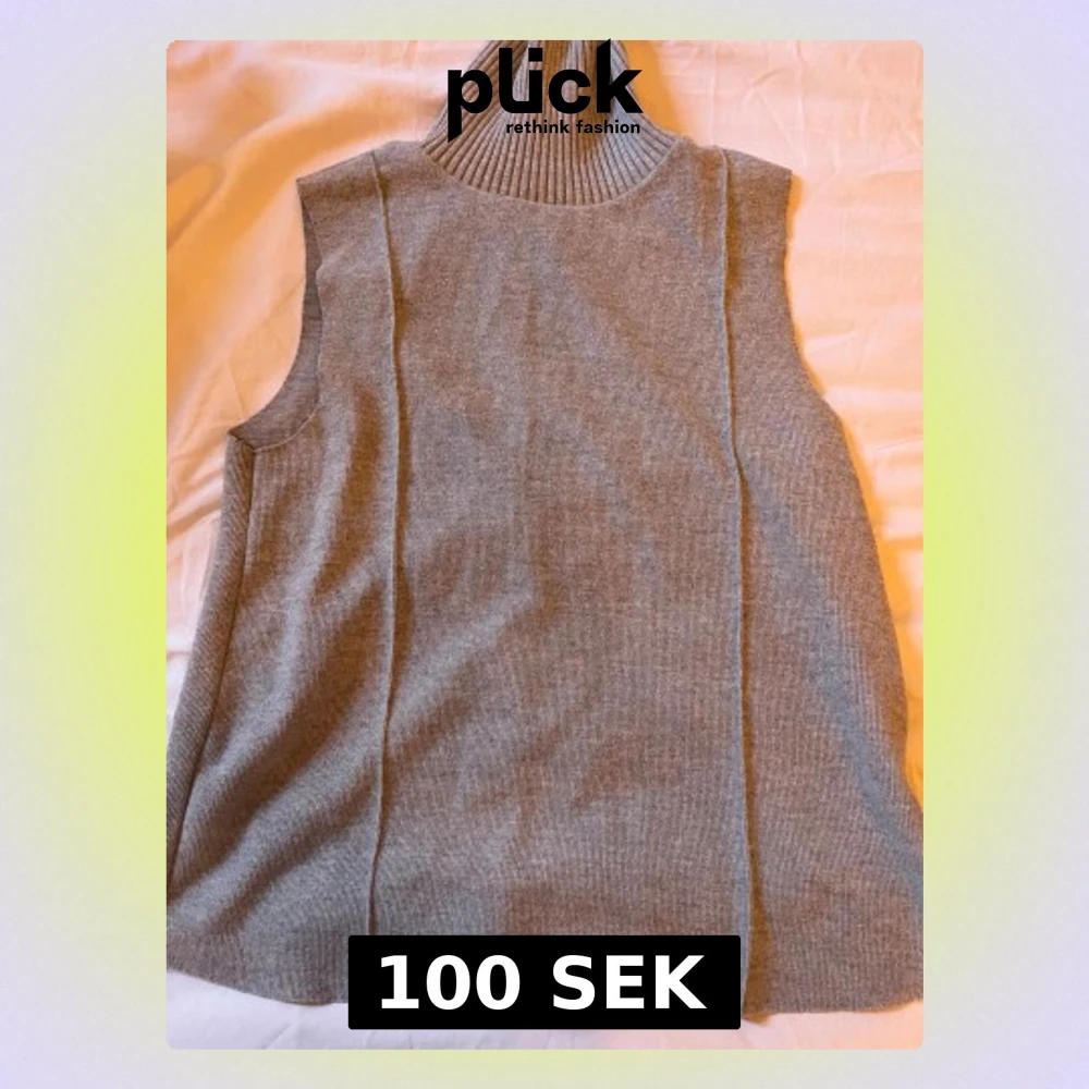 Snygg grå stickad väst med hög polokrage och ribbad struktur. Västen är ärmlös och har en avslappnad passform, perfekt att slänga över en skjorta eller t-shirt för en cool lager-på-lager-look.