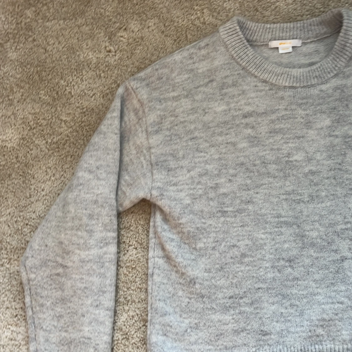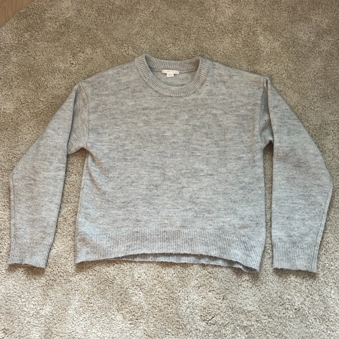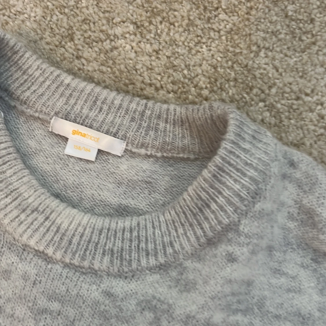 Grå stickad tröja från ginatricot i storlek 158-164. Tröjan sitter ganska avslappnat och har ett mjukt material. Köptes för drygt 1 år sen men har bara använts ett fåtal gånger. Det finns ett litet hål vid den vänstra armen fast det går att sy igen