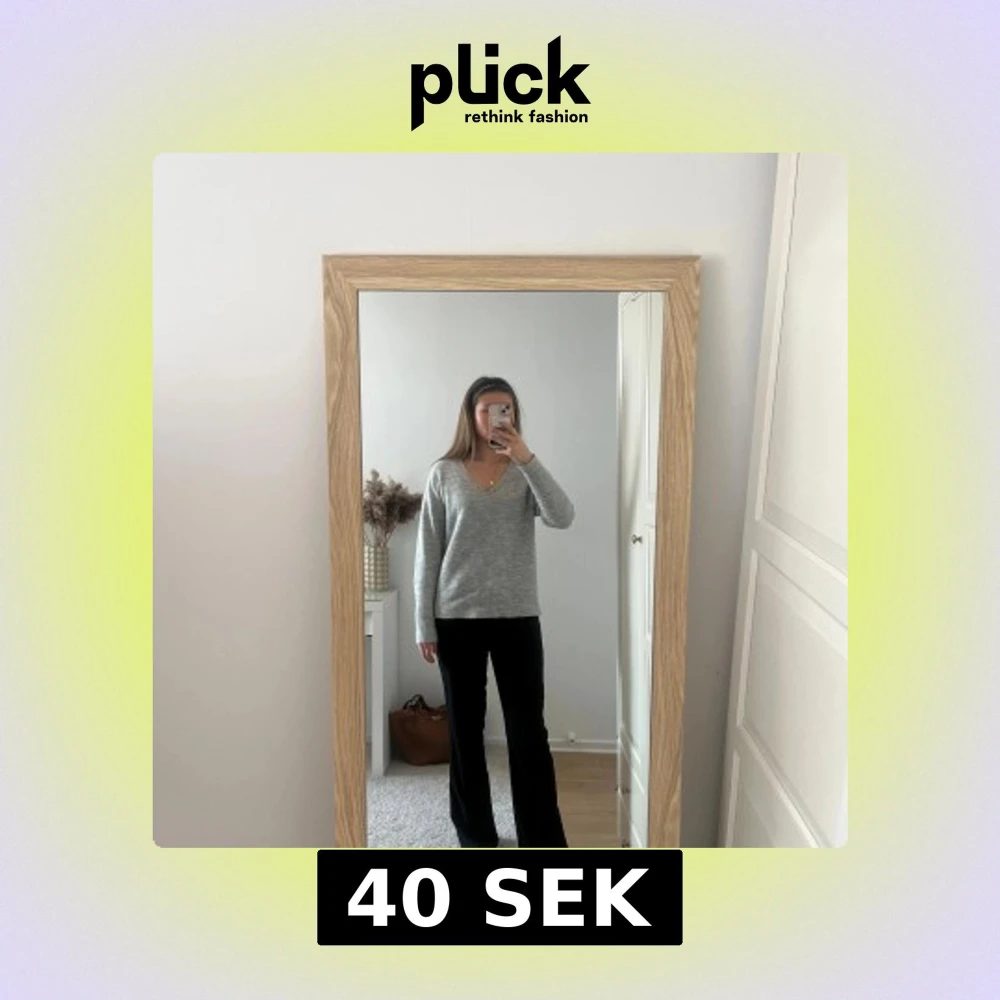 Säljer en enkel och stilren grå stickad tröja med v-ringning. Tröjan har lång ärm och en avslappnad passform, perfekt att matcha med jeans eller kostymbyxor.