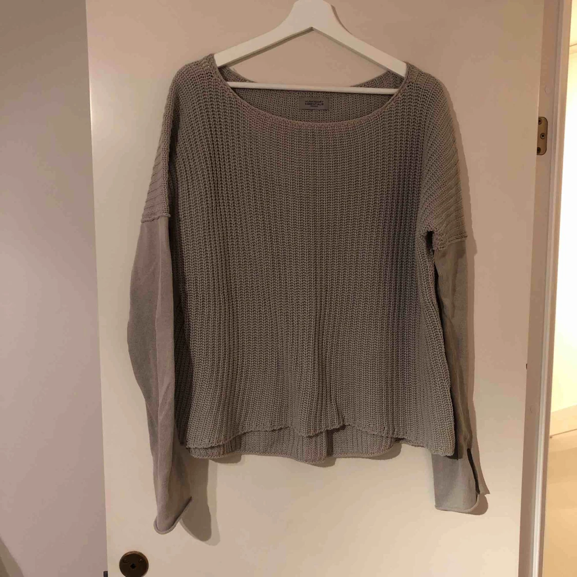 Stickad tröja från Hunkydory i ljusgrå färg och skönt bomullsmaterial. Sitter väldigt löst och har lågt hängande axlar. Urringningen börjar där nyckelbenet möter resten av axeln. Ärmarna är lite längre och ryggen går nästan förbi rumpan.