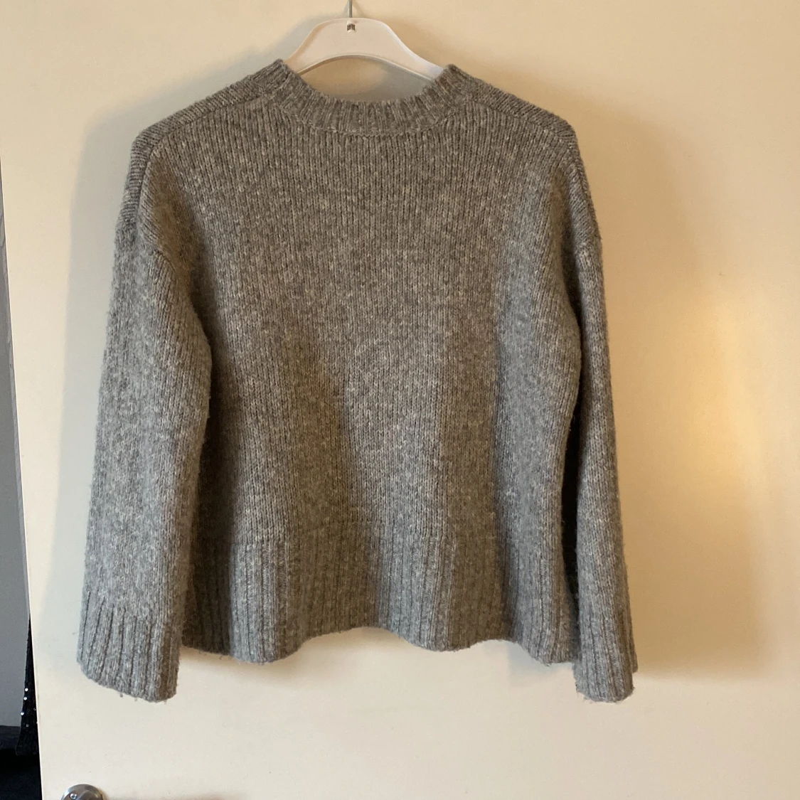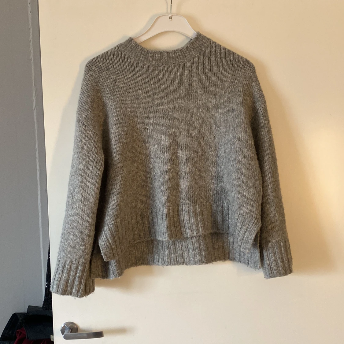 En jätte fin stickad tröja i storlek S, tröjan är kortare framtill och längre vid ryggen, säljs för den används aldirg 🫶🏻💗