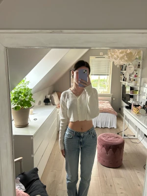 GrĂ€ddvit croppad stickad kofta, tunn i tyget, superfin till höstoutfits! Knappt anvĂ€nd! đ€đ€đ€