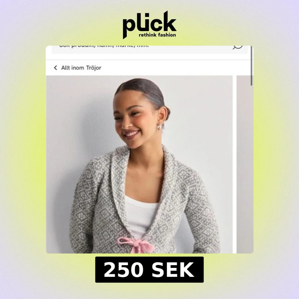 Superfin gråvit stickad kofta med diskret mönster och en söt rosa rosett i midjan. Koftan har lång ärm och en mysig krage, perfekt att slänga på sig över ett linne eller t-shirt. Den är från Nelly, i helt nyskick, ord pris 499 mitt pris 250😇