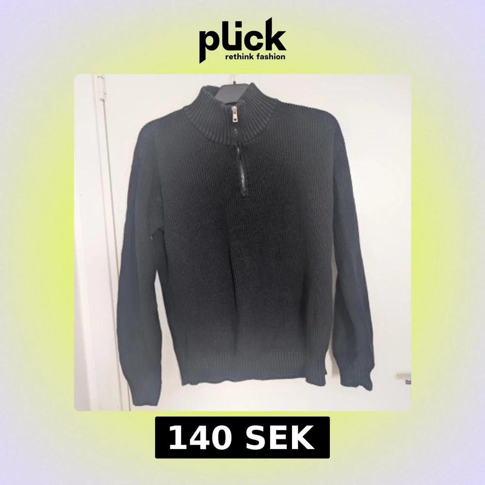 Svart ribbstickad tröja med hög krage och half zip-dragkedja framtill. Strl 158/164 (stor i storlek) motsvarar en S i herr.