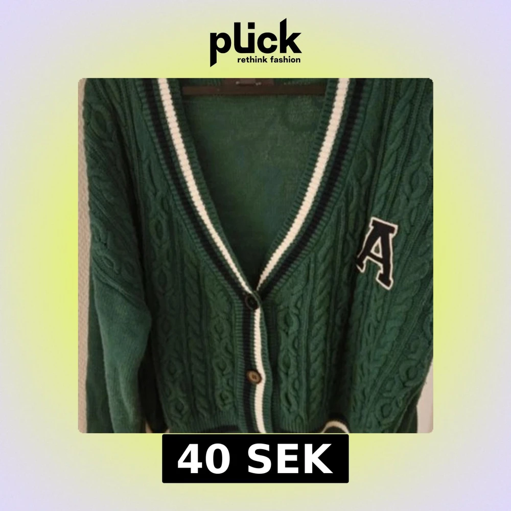 Säljer en snygg grön kofta från Primark med kabelstickat mönster och en stor bokstav 'A' på bröstet. Koftan har en v-ringad design med knappar framtill och ribbade kanter i vitt och mörkblått.