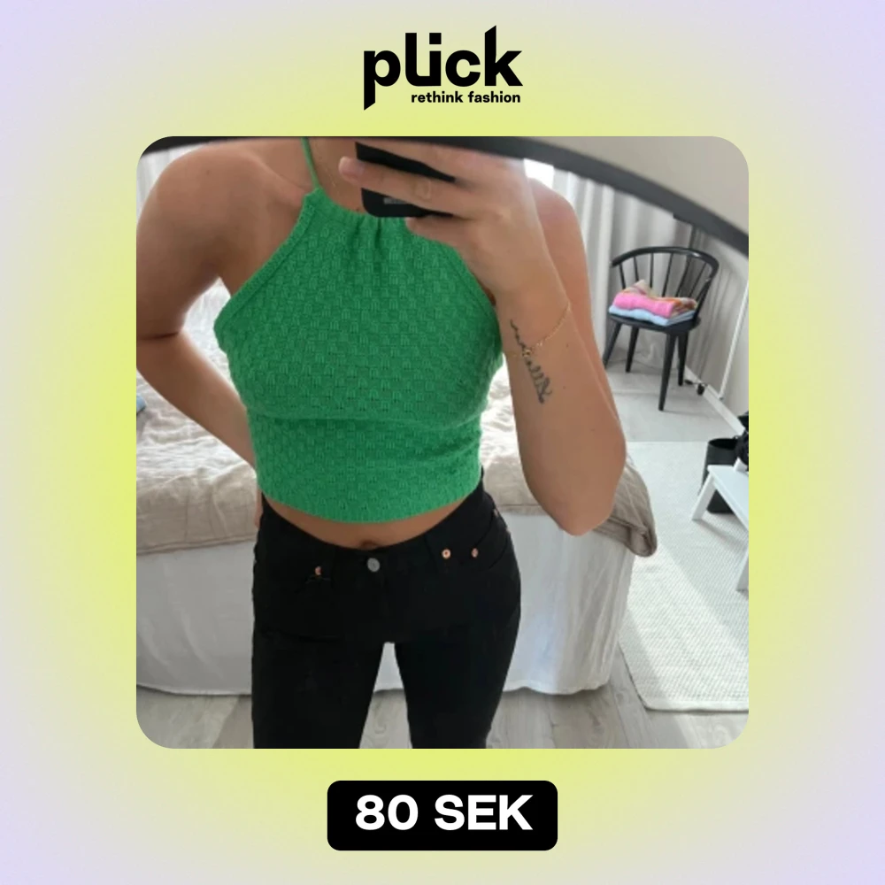 Säljer en superfin grön halterneck topp som är perfekt för sommaren! Den är ribbad och har en snygg öppen rygg med knytband. Toppen är croppad och sitter tight, vilket gör den perfekt för både fest och vardag. Den är i nyskick 💚