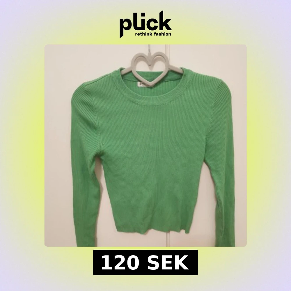 Snygg grön ribbad tröja från Stradivarius med lång ärm och rund hals. Modellen är figurnära och croppad, perfekt att styla med höga jeans eller kjol. Enkel men trendig look som passar året runt.
