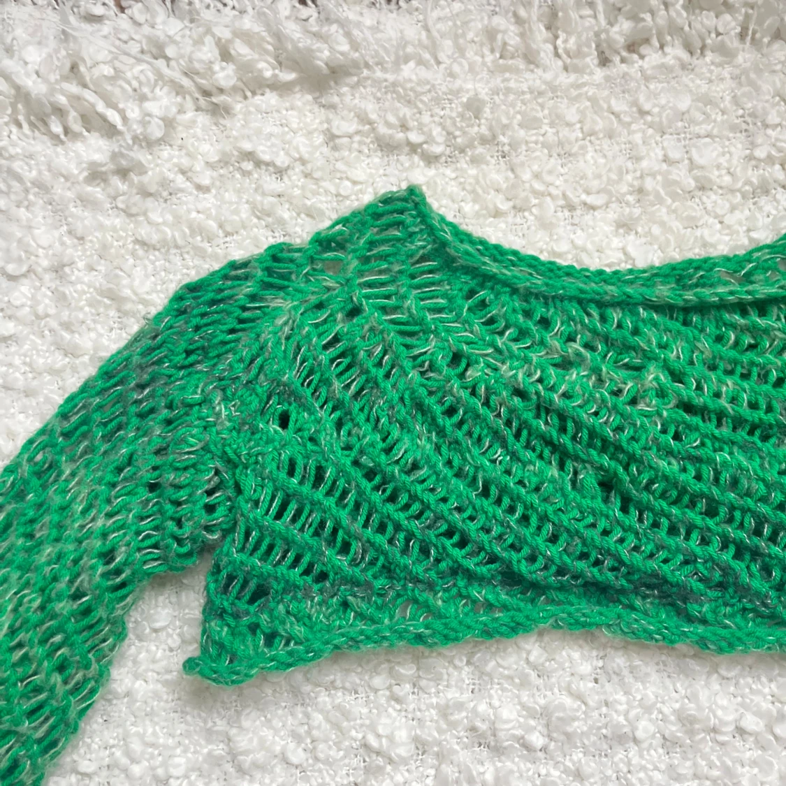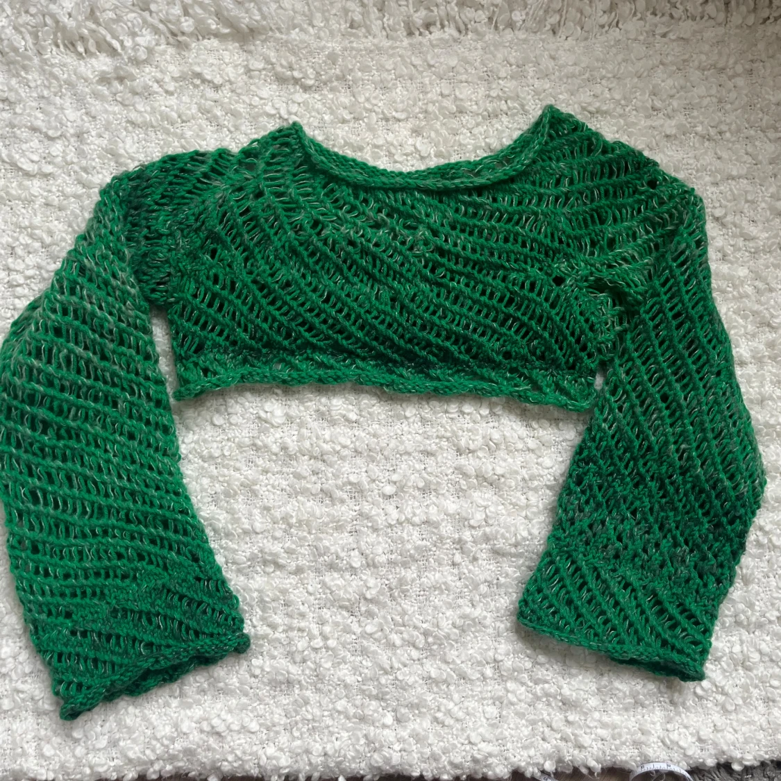 Egentillverkad stickad bolero/shrug i fin grön färg! Passar perfekt både på vintern och sommaren. Armlängd (armhåla - kant): ca 48 cm. Höjd: ca 20 cm. Skulle säga ca stl S/M.