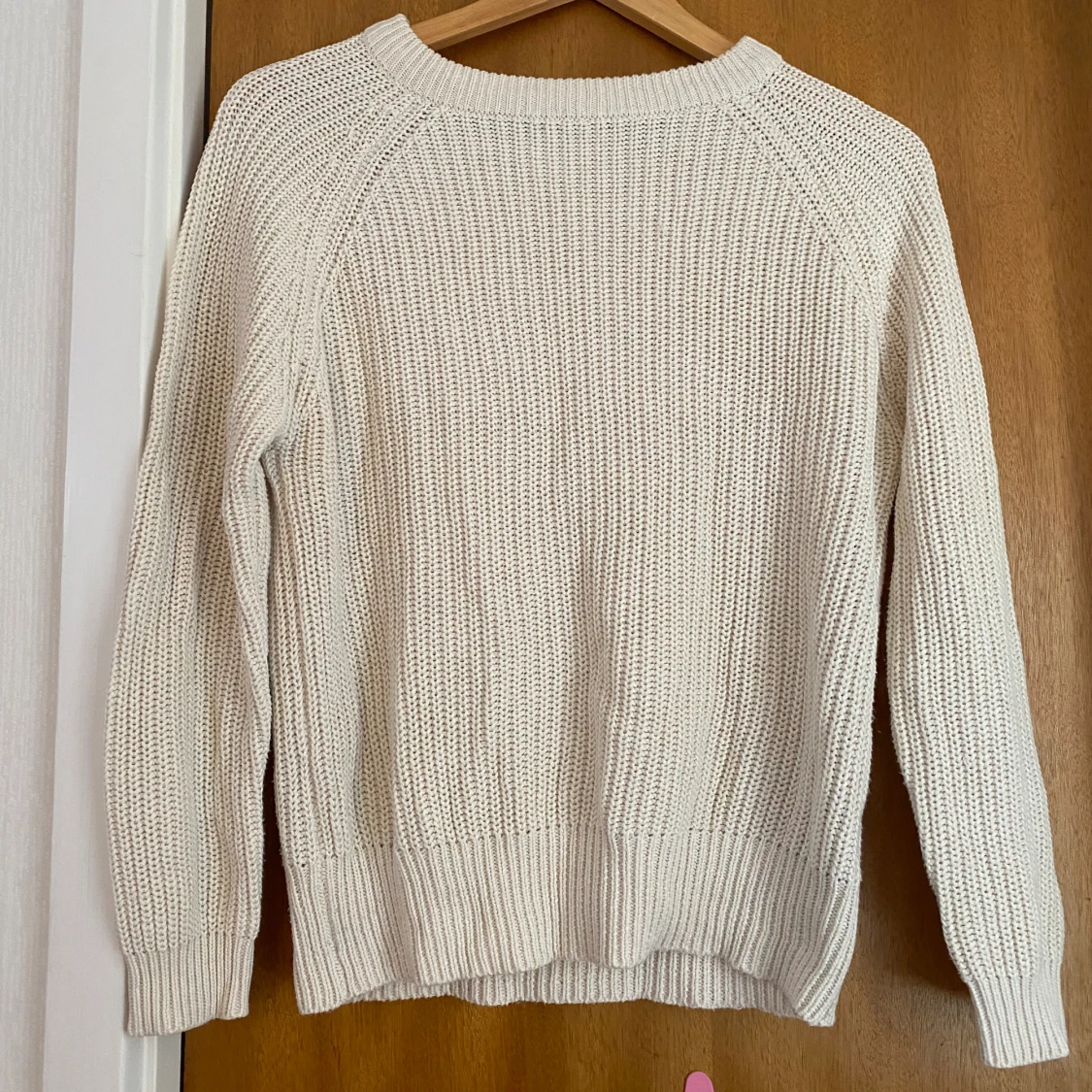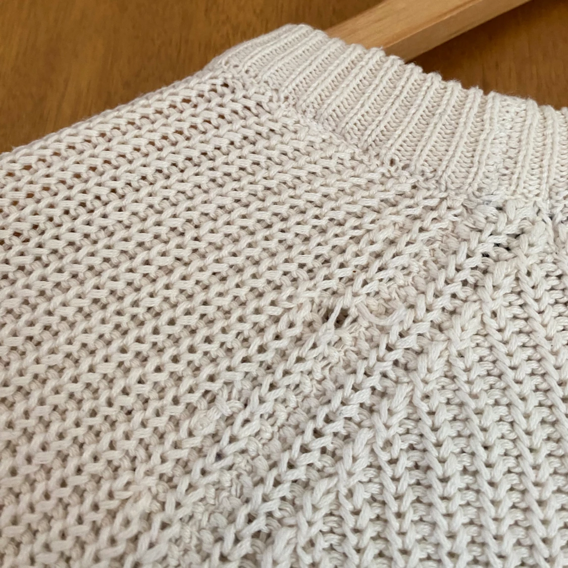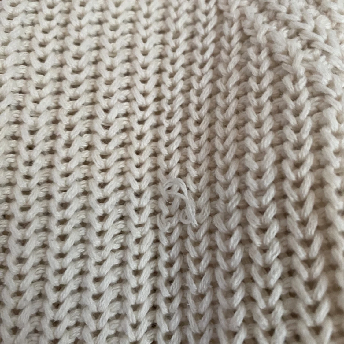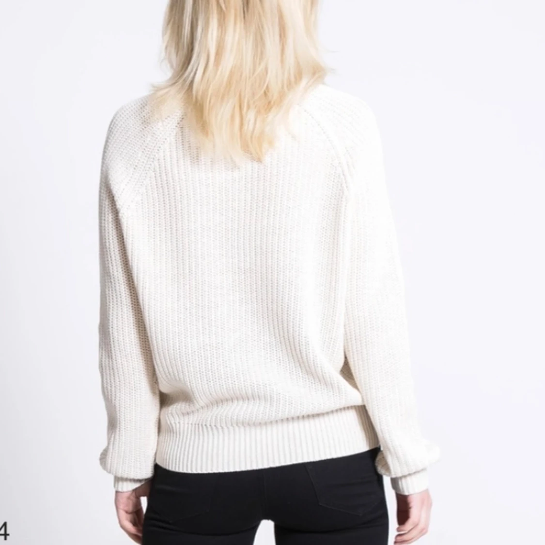 Den är cremevit i färgen, finns ett litet hål ungefär nedanför ena axeln på baksidan av tröjan, finns även någon maska (se bild 3 och 4). I övrigt gott skick.