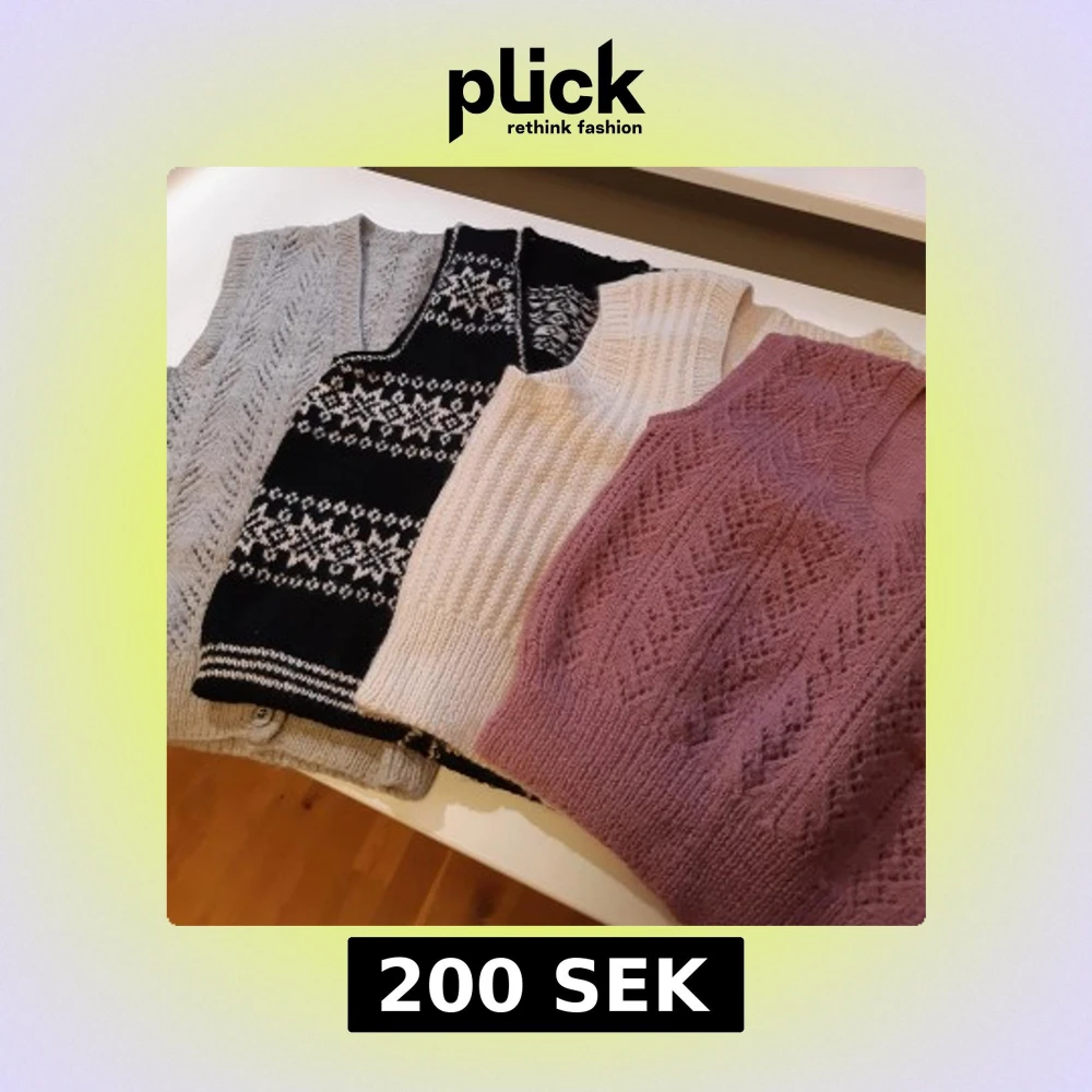 Säljer 4 egenstickade ullvästar för 175kr/st, alternativt: 300kr för 2 av västarna; 375 kr för 3 av västarna; eller 425kr för alla 4 västarna. Skriv gärna vid frågor, eller om ni vill se fler bilder på plaggen. Alla västarna är i mycket bra skick, så när som på att den grå har en liten fläck längst ner på framsidan. OBS! Skriv till mig innan ni trycker på köp, om ni vill köpa flera västar. Om ni bara vill köpa en så går det bra att trycka på köp direkt, men skriv då sen vilken väst ni vill ha! ❤