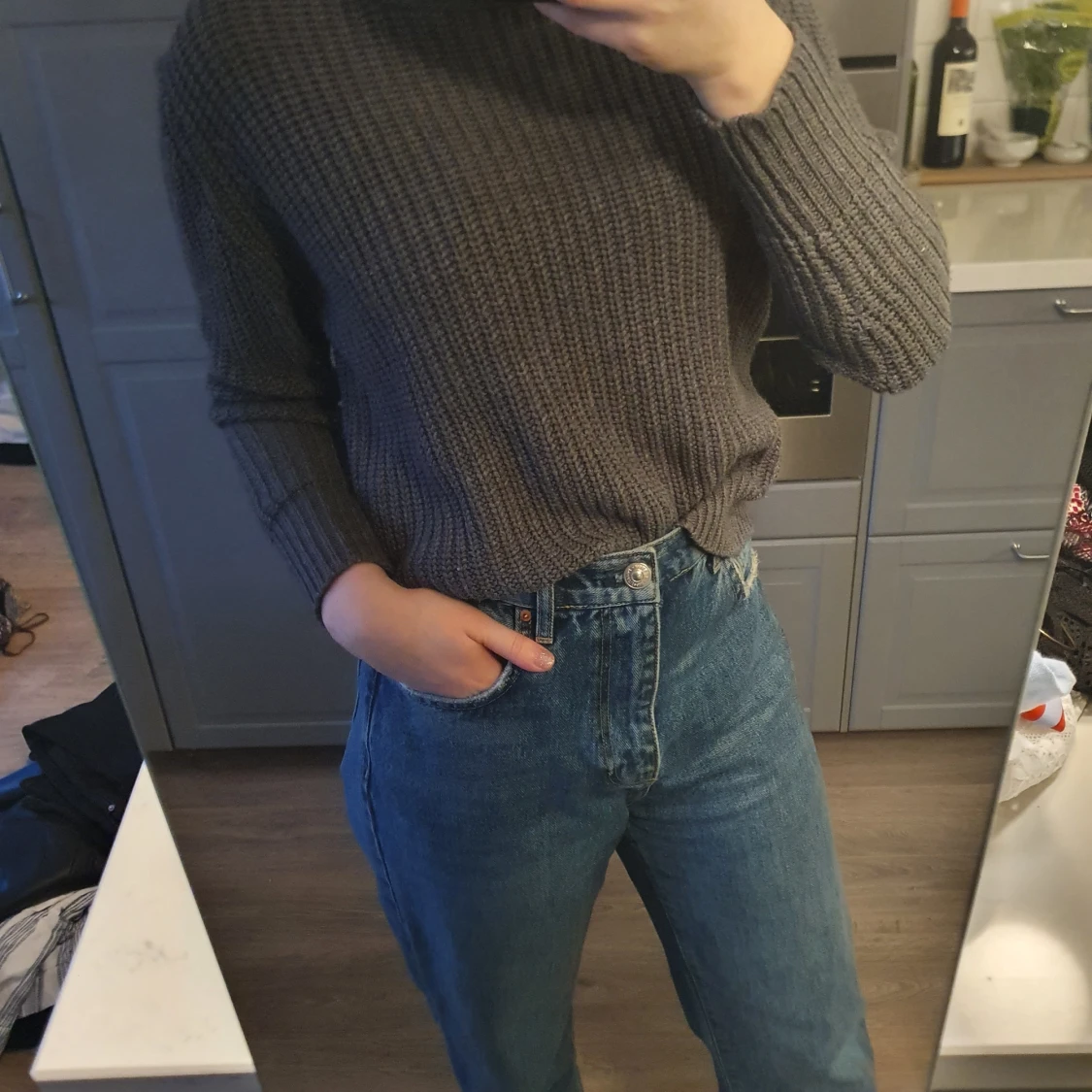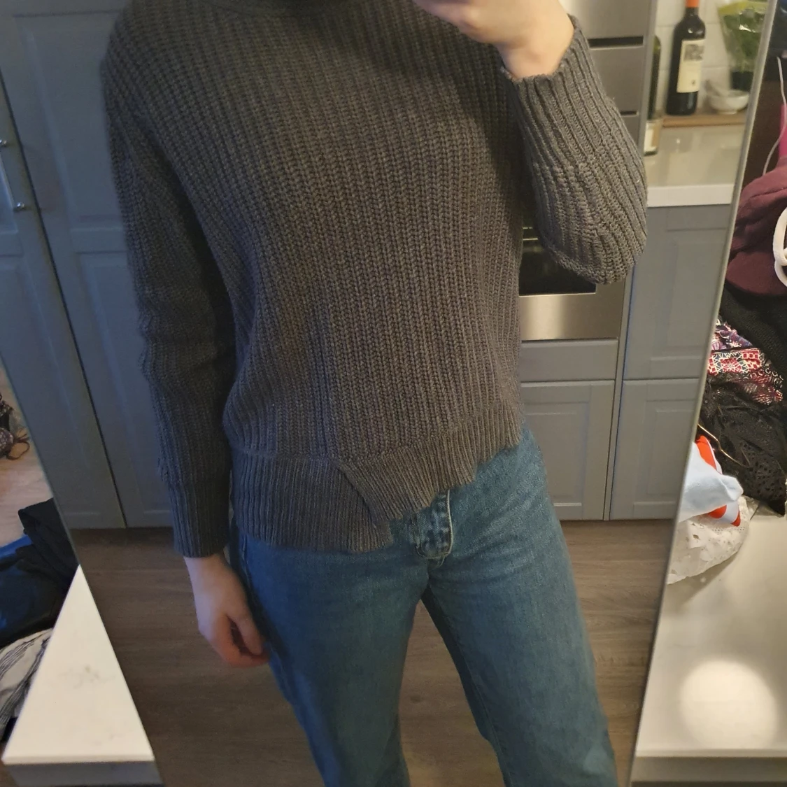 Stickad polotröja med "skurning" längst ner (se bild två). Jag gillar dock att stoppa in den i byxorna för annan look. Väldigt varm och mysig, sticks ej!!