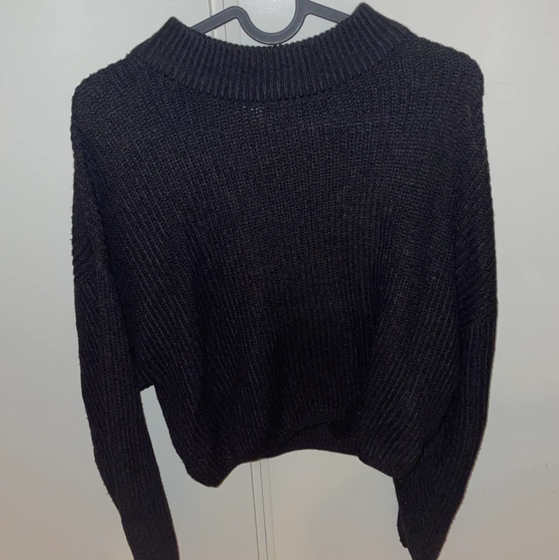 Säljer en svart stickad tröja från h&m. Fin stickad tröja! Storleken är L men skulle säga att den är mindre i storleken om man inte vill ha den kortare!