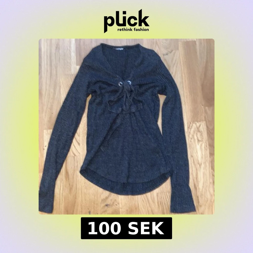 Säljer en mörkgrå ribbad stickad tröja med snygg snörning framtill. Tröjan har lång ärm och en lite djupare v-ringning. Perfekt för dig som gillar en lite edgy och trendig look. Vet inte vart den är ifrån men köptes någonstans i Sverige iallafall. Har 2 st mindre fläckar kom privat vid snabb affär kan jag sänka priset!
