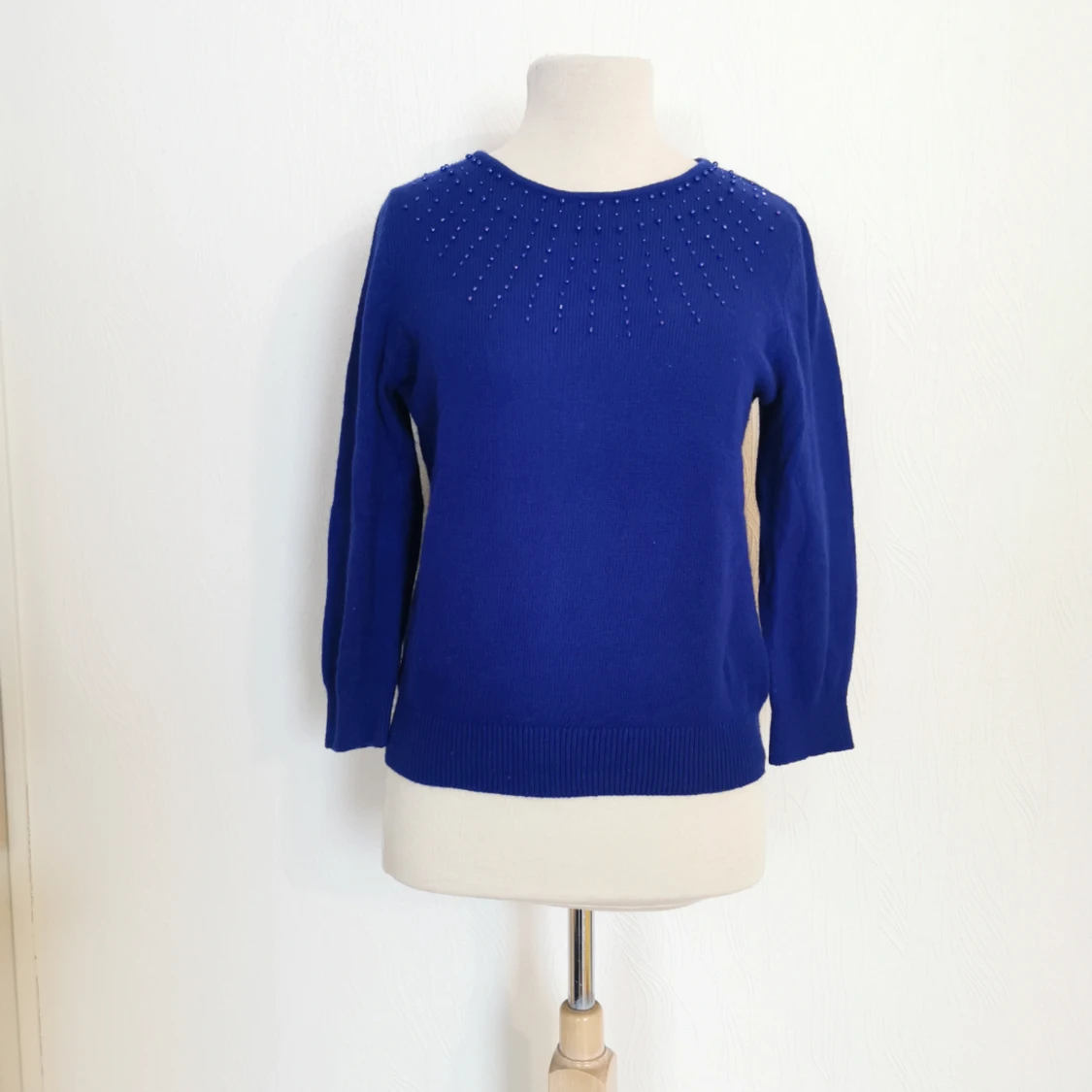 Stickad blå tröja med pärlbrodyr. Märke: H&M. Storlek: M, men upplevs mer som en S. Skick: väldigt fin, använd ett fåtal gånger. Pris: 80 kronor eller bud. Frakt: Betalas av köparen.