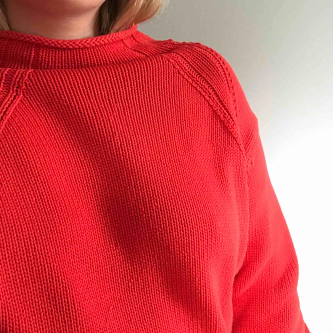 Stickad smultronröd tröja med lite halvpolo. Vida ärmar som smalnar av vid handlederna. Frakt tillkommer <3