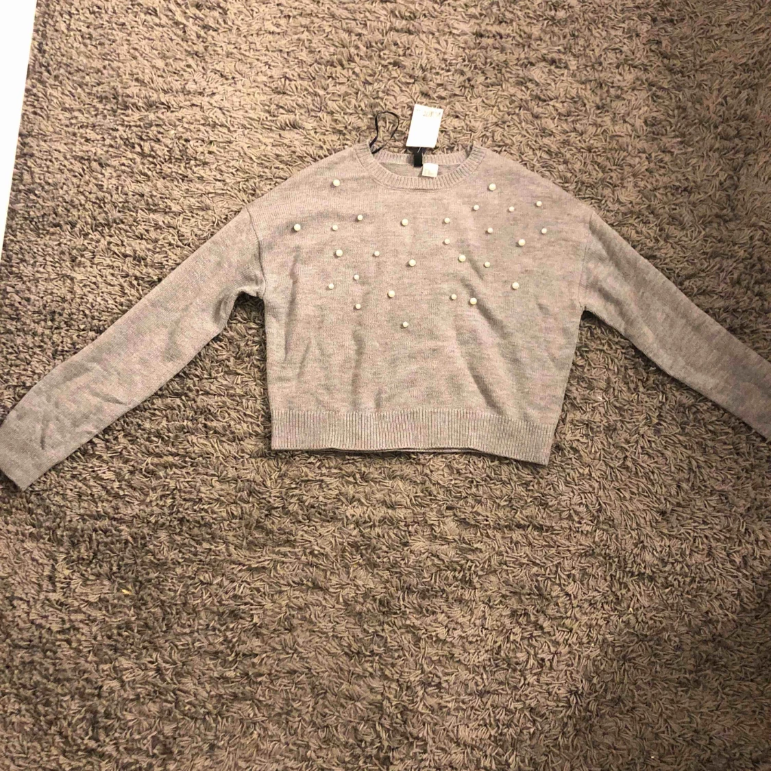 en grå stickad tröja med lite pärlor, helt oanvänd