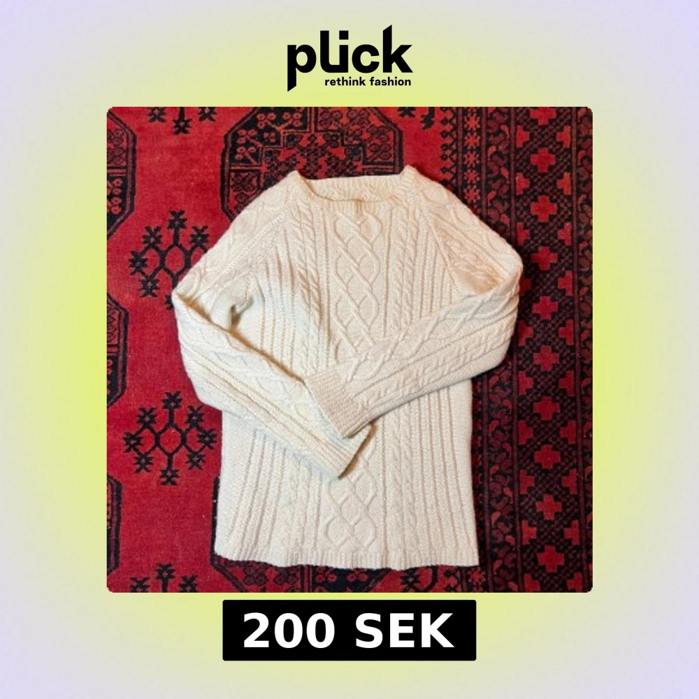 Säljer en stilren vit hemstickad tröja med kabelstickat mönster. Tröjan har långa ärmar och en klassisk rund halsringning. Perfekt för kyligare dagar.