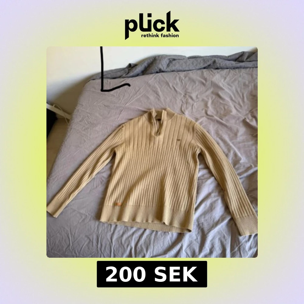 Säljer en beige stickad tröja från Aiopeson med ribbad struktur och halv dragkedja vid halsen. Tröjan har hög krage och långa ärmar, perfekt för lager-på-lager. Märkesdetaljer i metall och läder framtill.