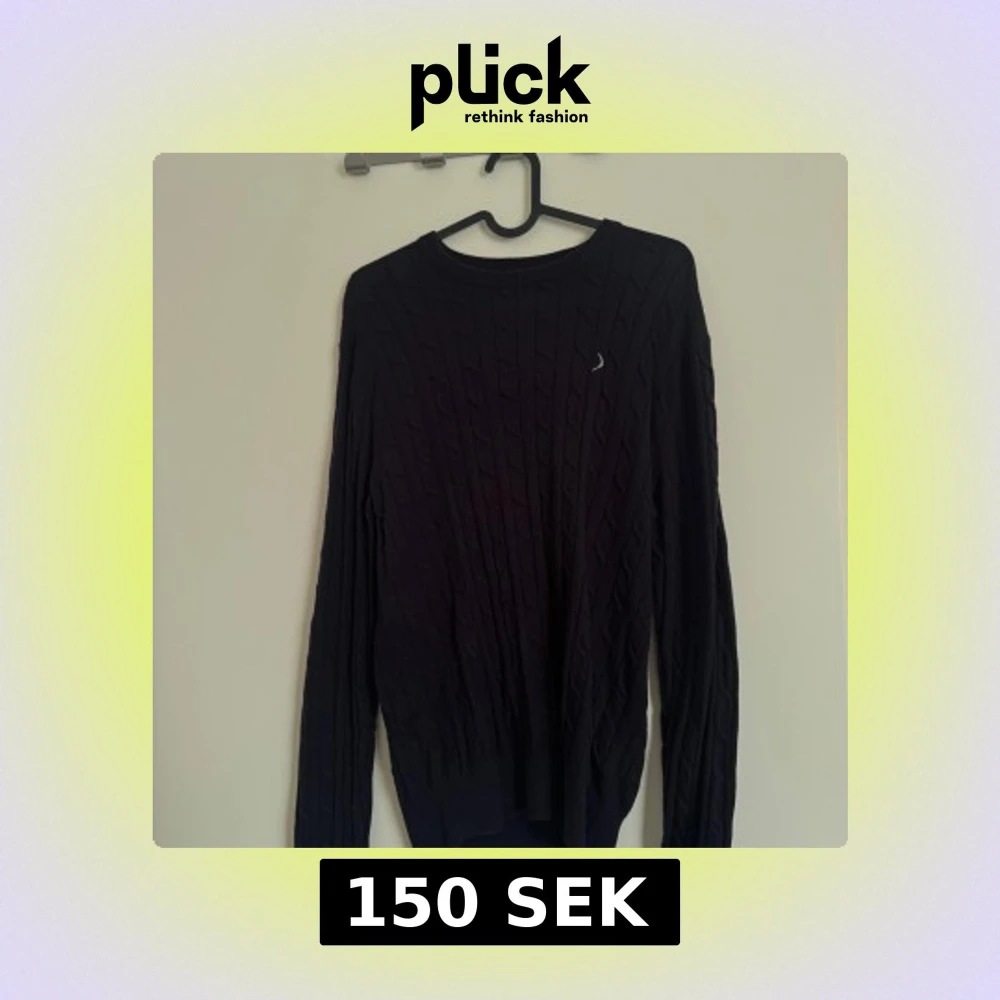 Säljer en mörkblå stickad tröja från Boomerang med kabelstickat mönster och rund halsringning. Tröjan har långa ärmar och en liten broderad logga på bröstet. Perfekt för kyligare dagar.