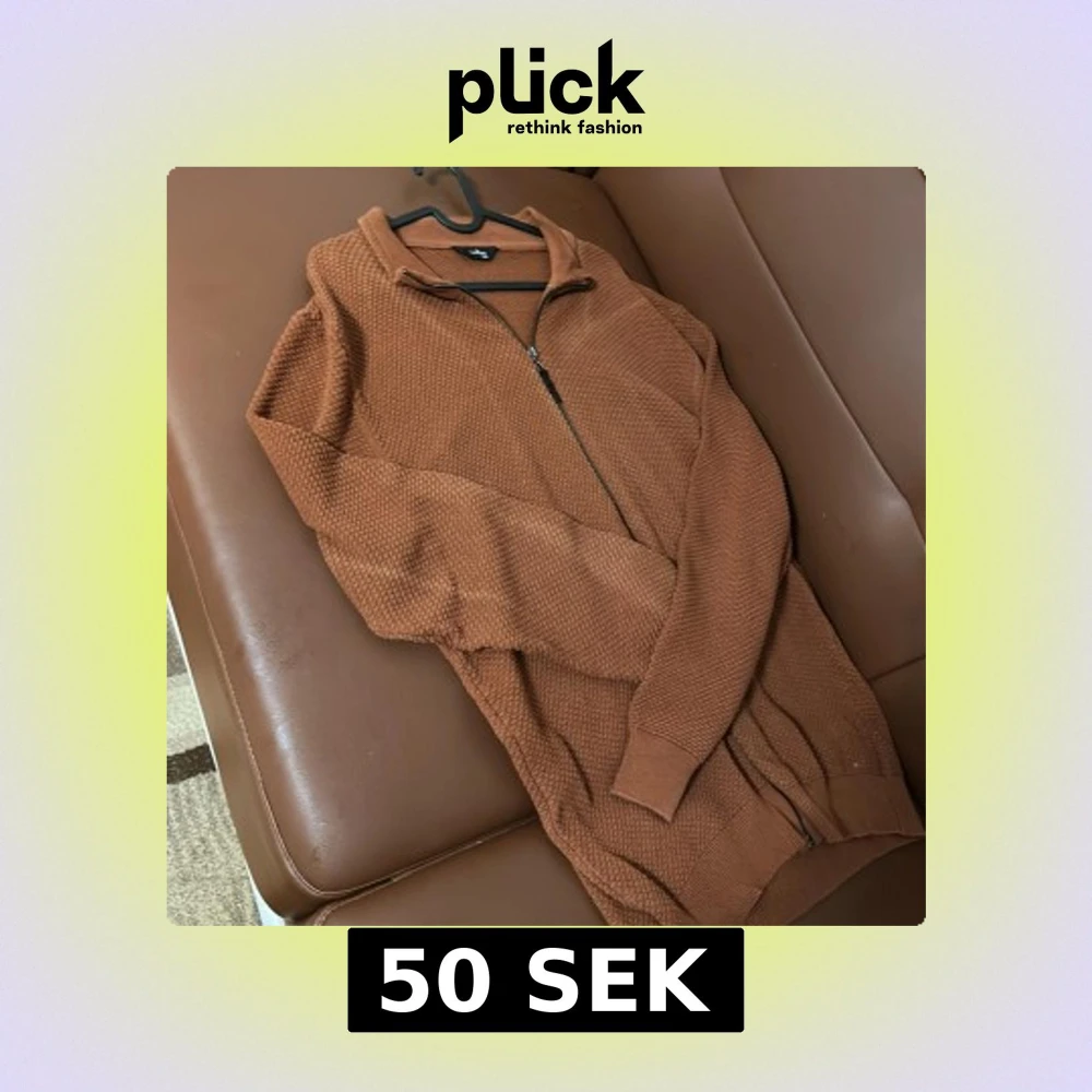 Säljer en brun stickad tröja från Tudors i storlek XXL. Tröjan har en dragkedja framtill och en ribbad krage. Perfekt för kyligare dagar med sin mysiga och strukturerade design.