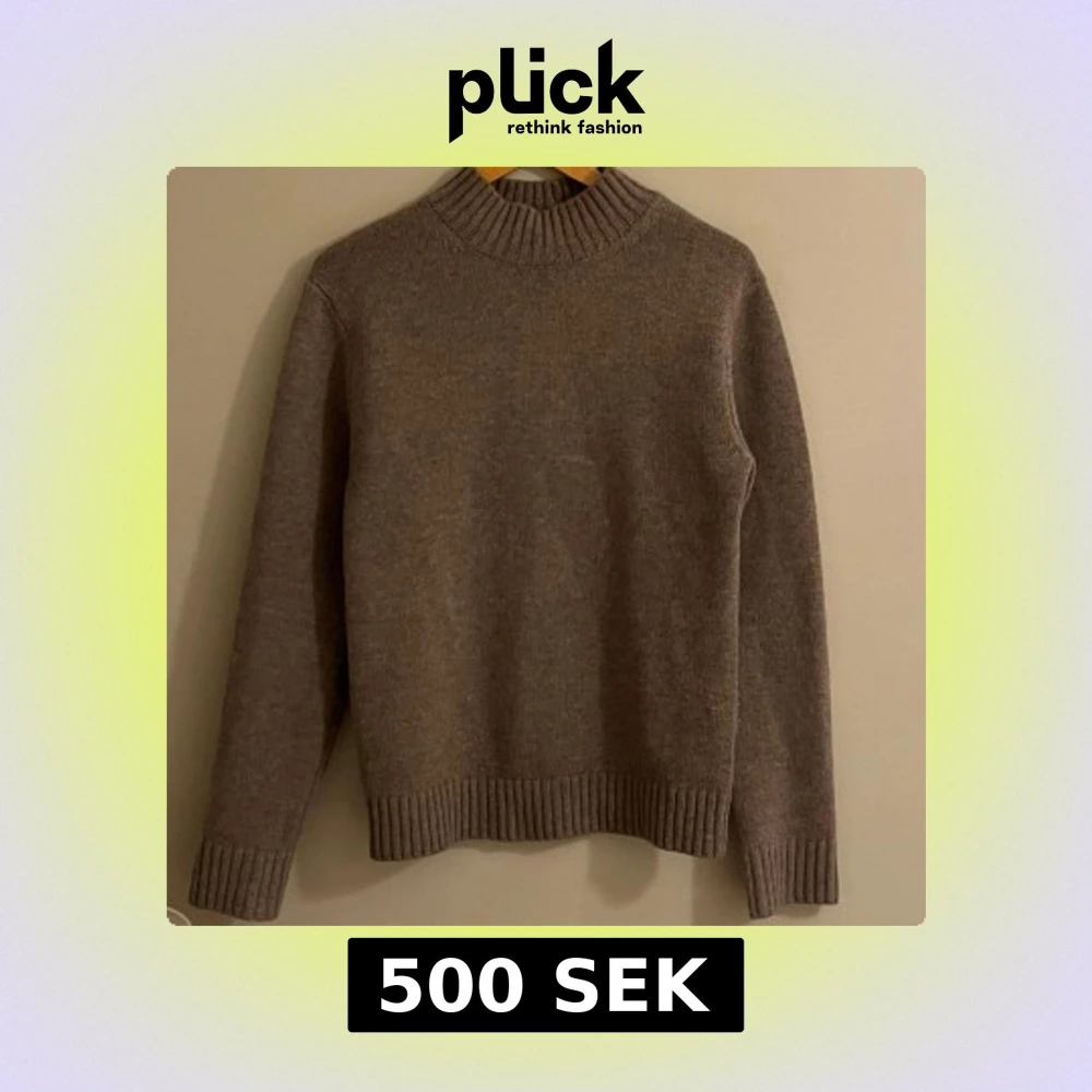 Säljer en mysig beige stickad tröja med ribbad krage och muddar. Perfekt för kyliga dagar och ger en stilren look.