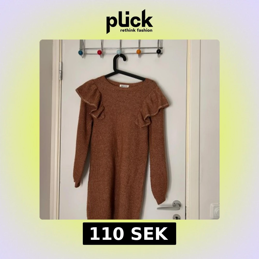 Säljer en mysig brun stickad klänning från H&M med volangdetaljer vid axlarna. Klänningen har långa ärmar och en rund halsringning, perfekt för kyligare dagar.