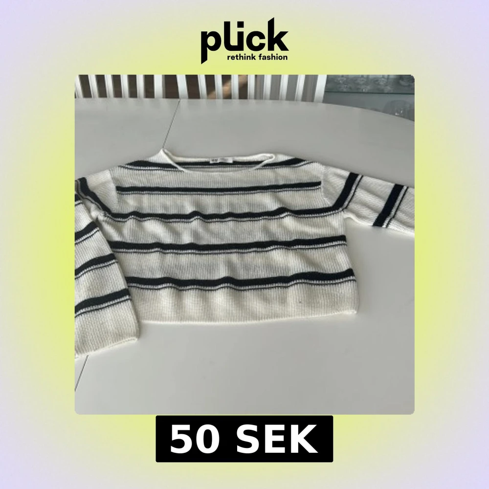 Vit och svart randig stickad tröja från H&M i storlek 146/152. Tröjan har en klassisk rund halsringning och långa ärmar. Den ribbade strukturen ger en snygg och avslappnad look, perfekt för dig som gillar stilrena basplagg med lite edge.