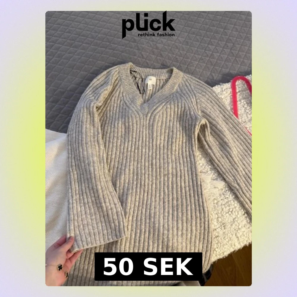 Lång, beige ribbstickad klänning från H&M med v-ringning och långa ärmar. Klänningen har en mjuk och stretchig känsla, perfekt för lager på lager. Enkel men snygg design som passar till många olika stilar.