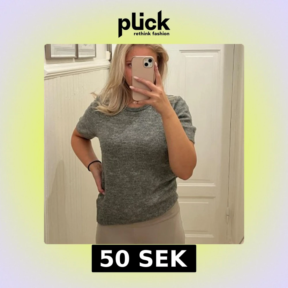 Mysig grå stickad tröja med korta ärmar och rund halsringning. Tröjan har en enkel och stilren design med ribbade kanter vid ärmslut och nederkant. Perfekt för lager-på-lager och funkar året runt.