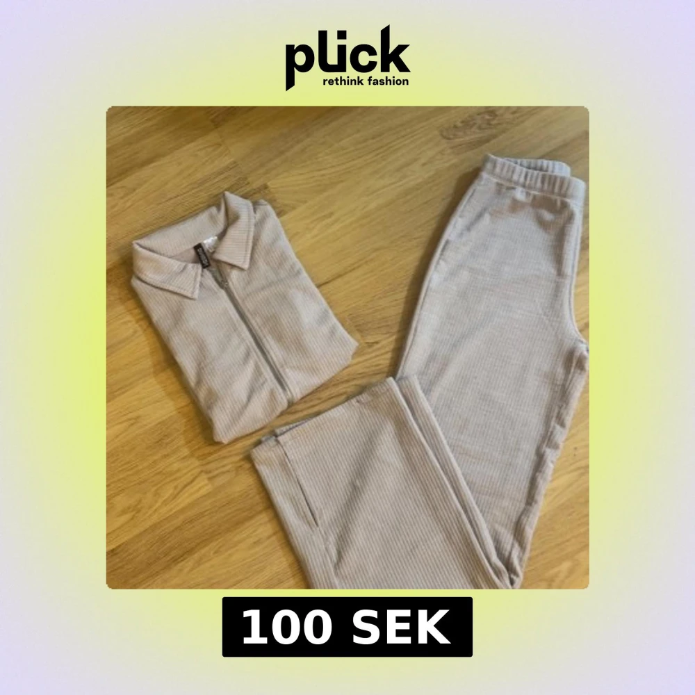 Säljer ett par beige ribbade mjukisbyxor med resår i midjan och raka ben. Byxorna kommer med en matchande ziptröja med krage. Perfekt för en avslappnad och stilren look.