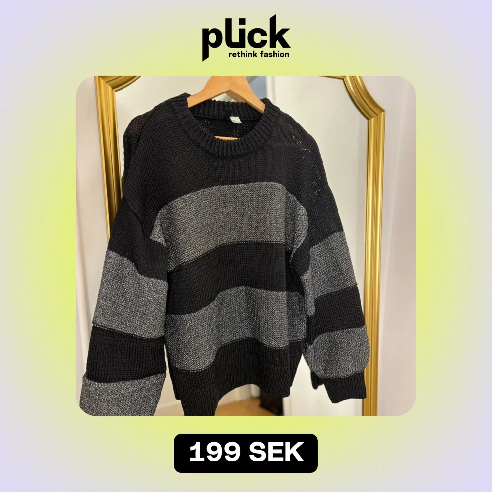 Säljer en supermysig stickad tröja från HM med breda svarta och grå ränder. Perfekt för kyliga dagar med sin avslappnade passform och långa ärmar. Den har en klassisk rund halsringning och är i mycket bra skick. Passar perfekt till både jeans och kjol!