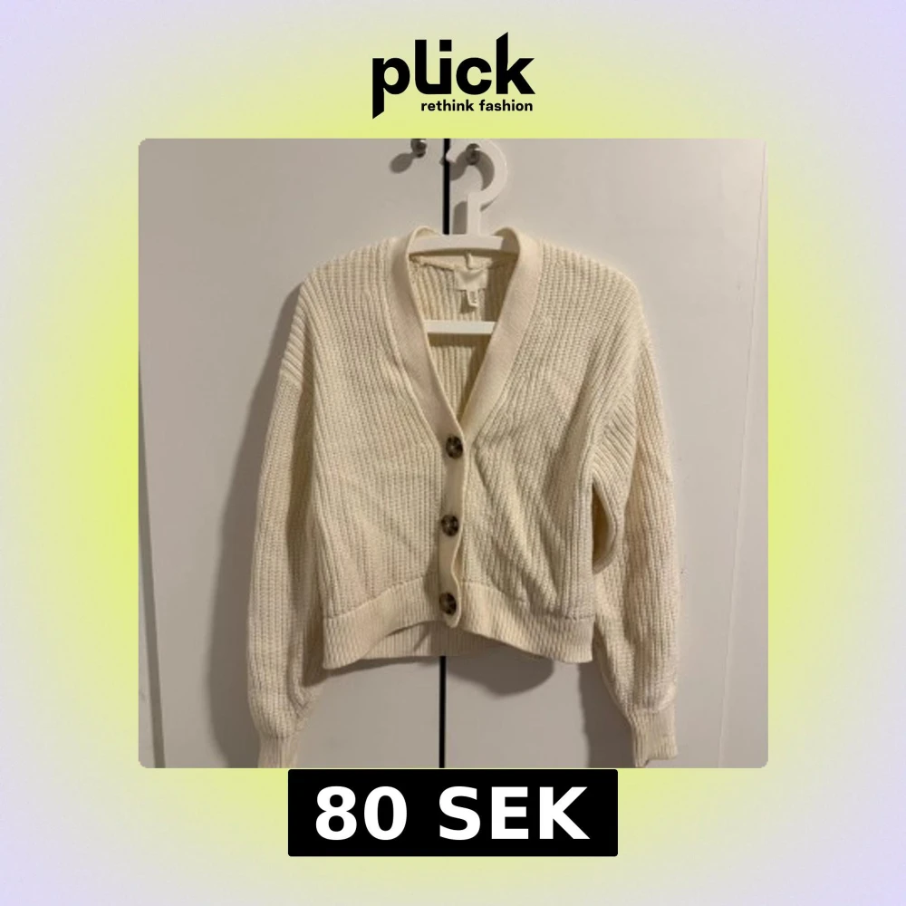 Säljer en stilren vit stickad kofta från H&M med stora knappar framtill. Koftan har en v-ringad design och långa ärmar, perfekt för kyligare dagar. Den är mjuk och bekväm att bära. Passar bra till både jeans och kjol.