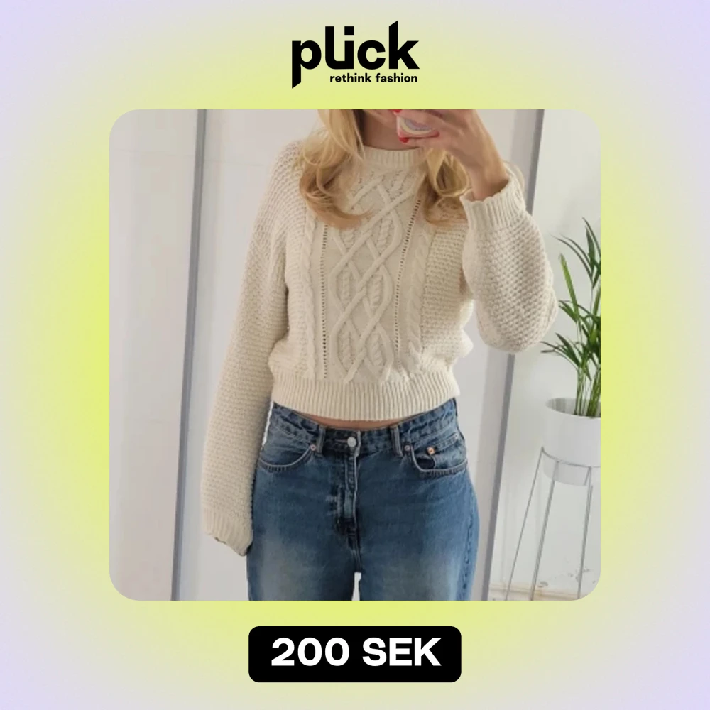 En krämvit stickad tjocktröja med mycket detaljer framtill. Lagom croppad och snygg halsringning och passform. Hör av dig om du har frågor!