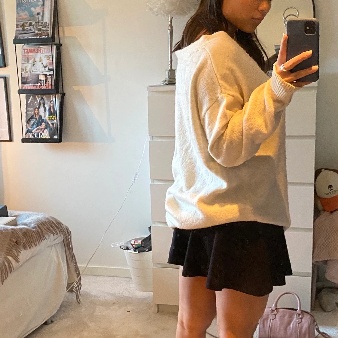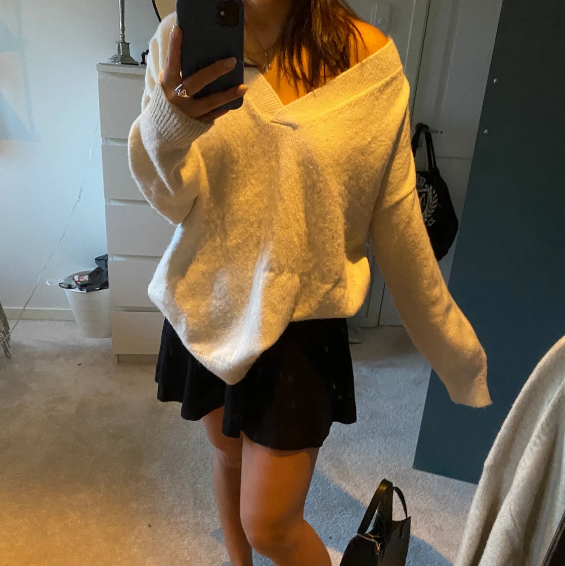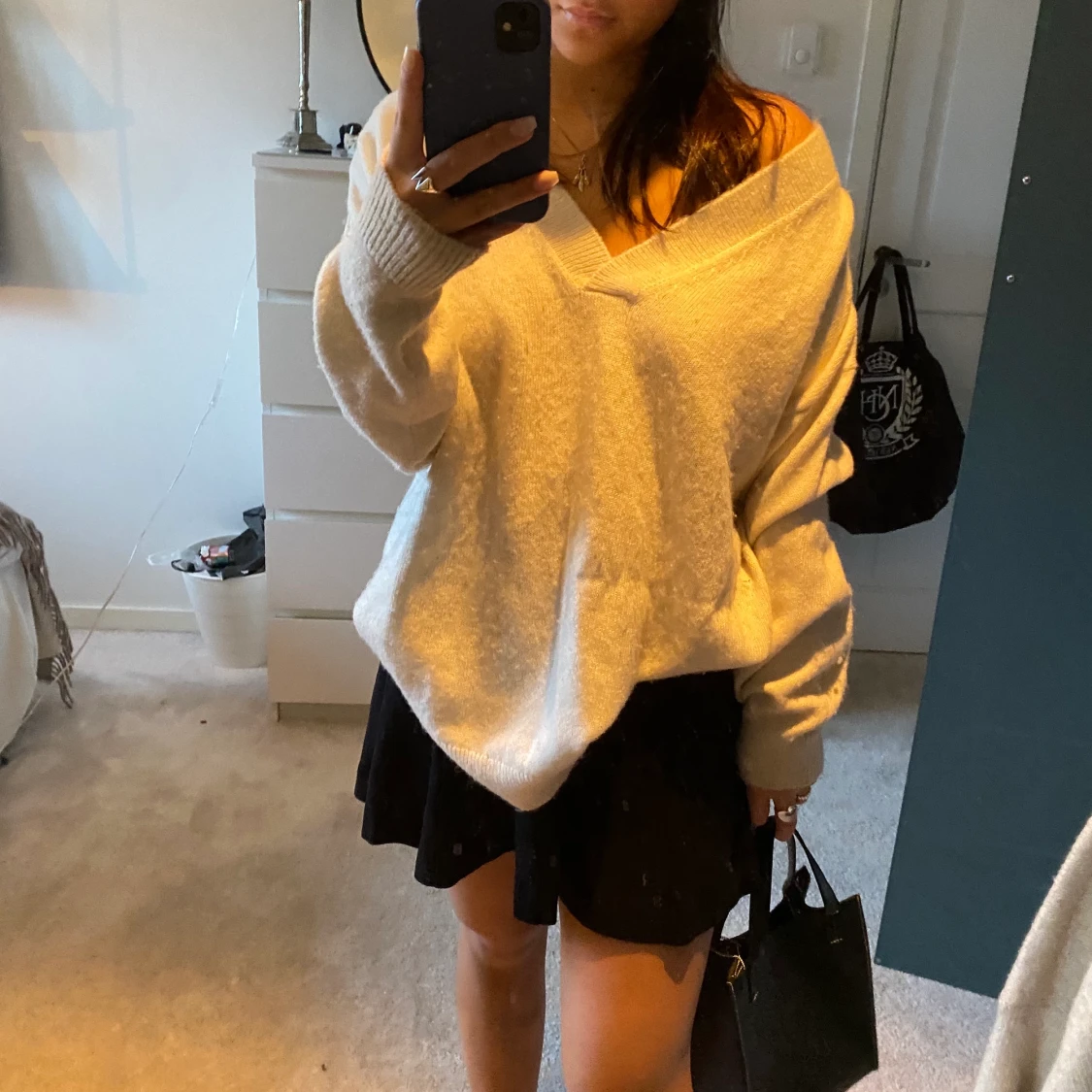 En jättemysig stickad tröja från Hm som knappt är använd! Storlek L och är i en längre modell vilket är jätte skönt på sommaren till en kjol eller liknade! Väldigt oversized i modellen! Krämvit i färgen! Frakt tillkommer!