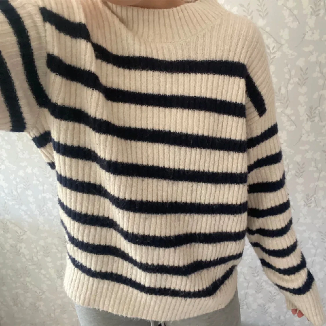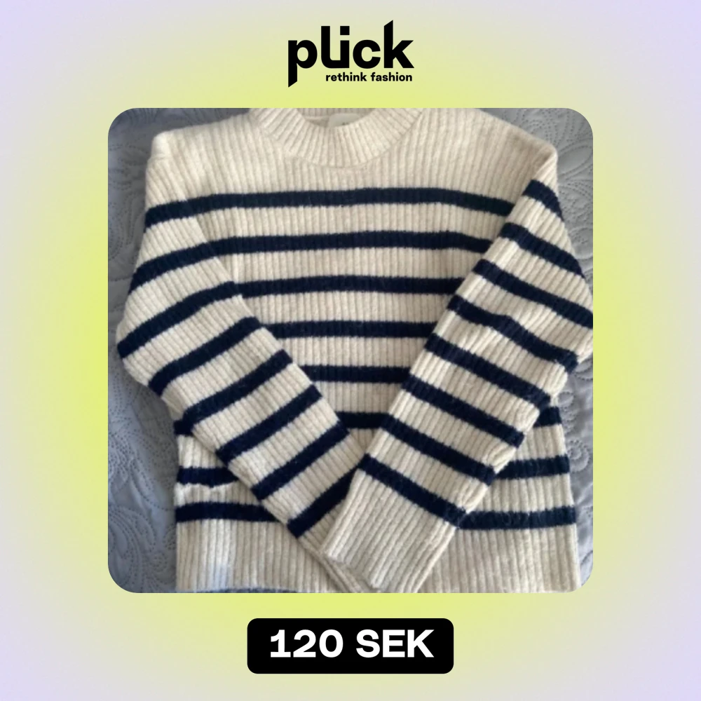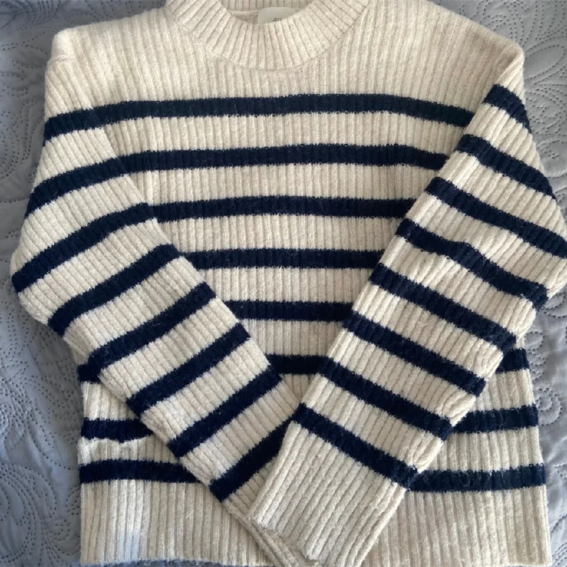 Vit stickad tröja med marinblå ränder, ifrån hm i storlek s. Använt fåtal gånger. Pris kan diskuteras💗💗