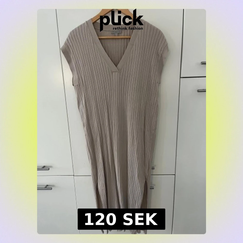 Säljer en beige ribbad långklänning som har slits på båda sidorna från H&M i storlek L. Klänningen är ärmlös med v-ringning och har en rak, avslappnad passform. Materialet är fin stickat och mjukt, perfekt för en chill och stilren look.