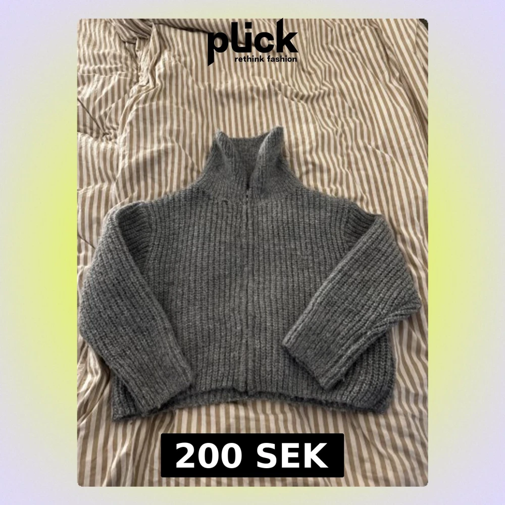 Mysig grå stickad tröja från H&M med grov ribbad struktur och zip-dragkedja framtill. Tröjan har en bred krage, långa ärmar och är jätte mysig, vilket är perfekt för vintern 💓 den är i storlek M och knappt använd