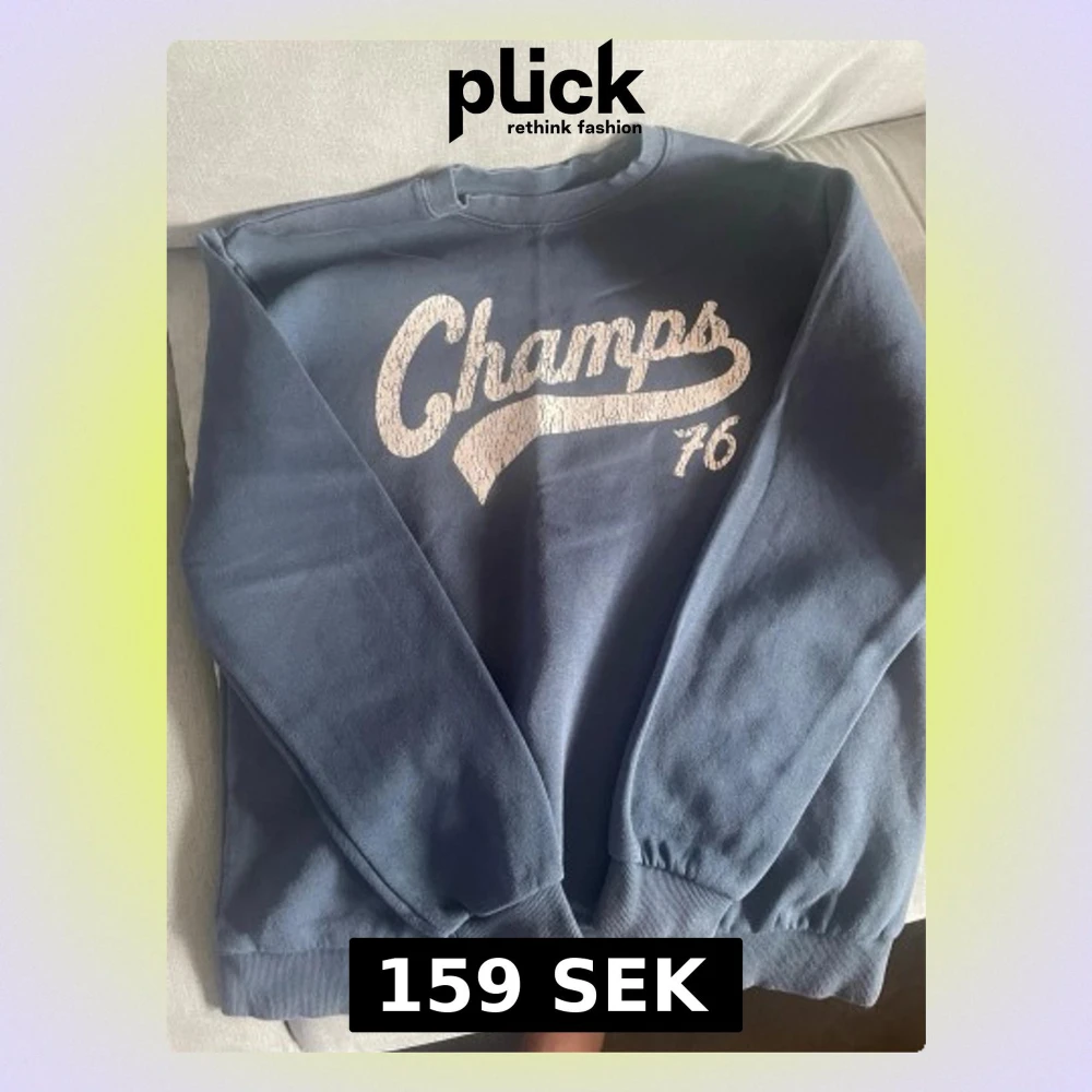 Mörkblå sweatshirt med vit text 'Champs 76' framtill i retrostil. Tröjan har rund hals, långa ärmar och ribbade muddar vid ärmslut och nederkant. Perfekt för en avslappnad och sportig look.