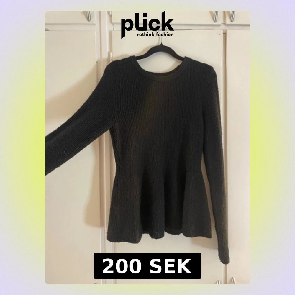 Säljer en svart populär stickad tröja från H&M med rund halsringning och lång ärm. Tröjan har en lätt utsvängd passform nedtill och är gjord i ett mjukt, ribbat material som känns skönt mot huden. Perfekt för lager på lager under kyliga dagar.