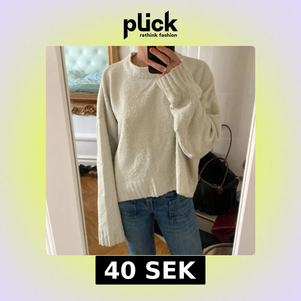 Mysig ljusbeige/vit stickad tröja från H&M med oversized passform och långa ärmar. Tröjan har ribbade muddar vid ärmslut och nederkant samt en rund halsringning.