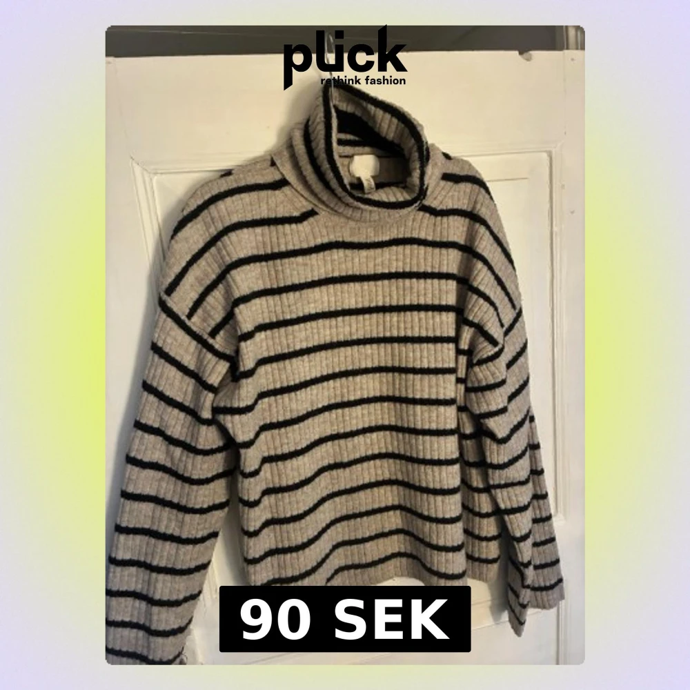 Stickad beige/grå polotröja från H&M med svarta horisontella ränder. Tröjan har ribbad struktur, hög polokrage och långa ärmar. Perfekt för kalla dagar och enkel att styla till olika outfits.