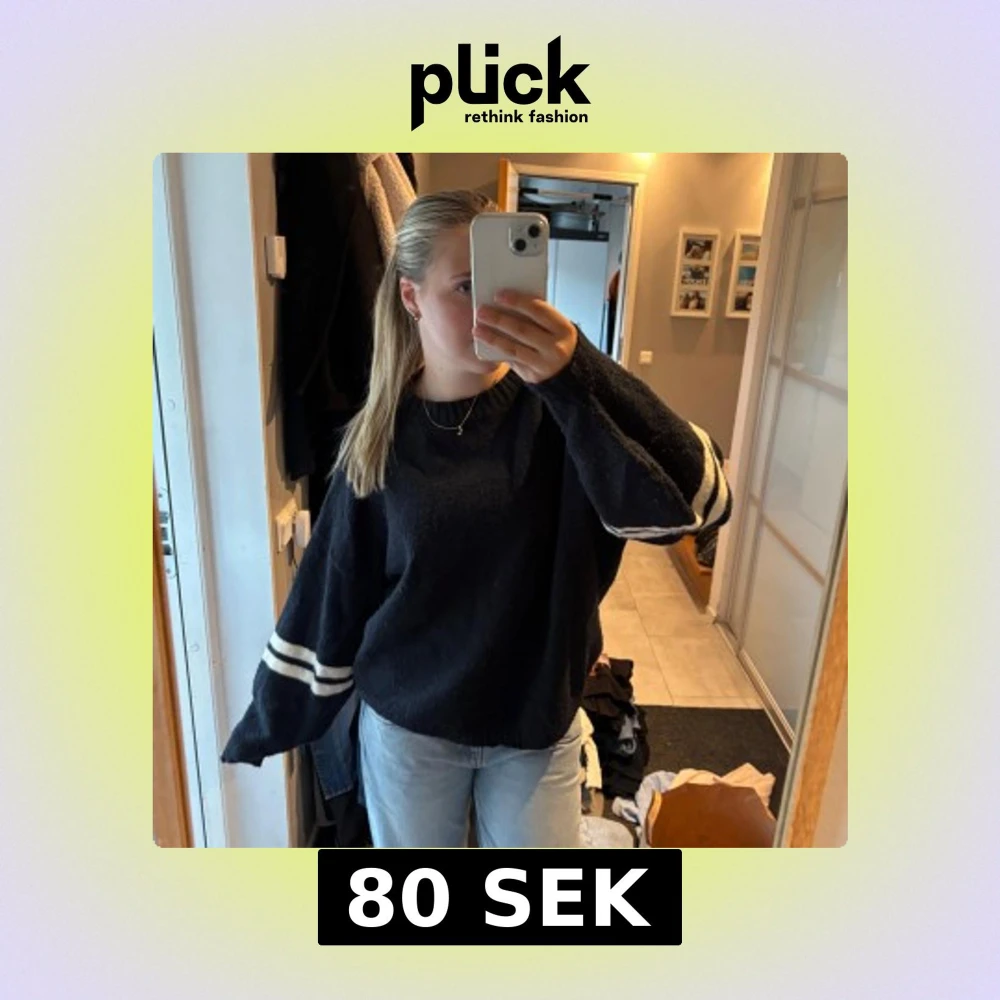 Mysig svart stickad tröja med oversized passform och långa ärmar. Ärmarna har två vita ränder.