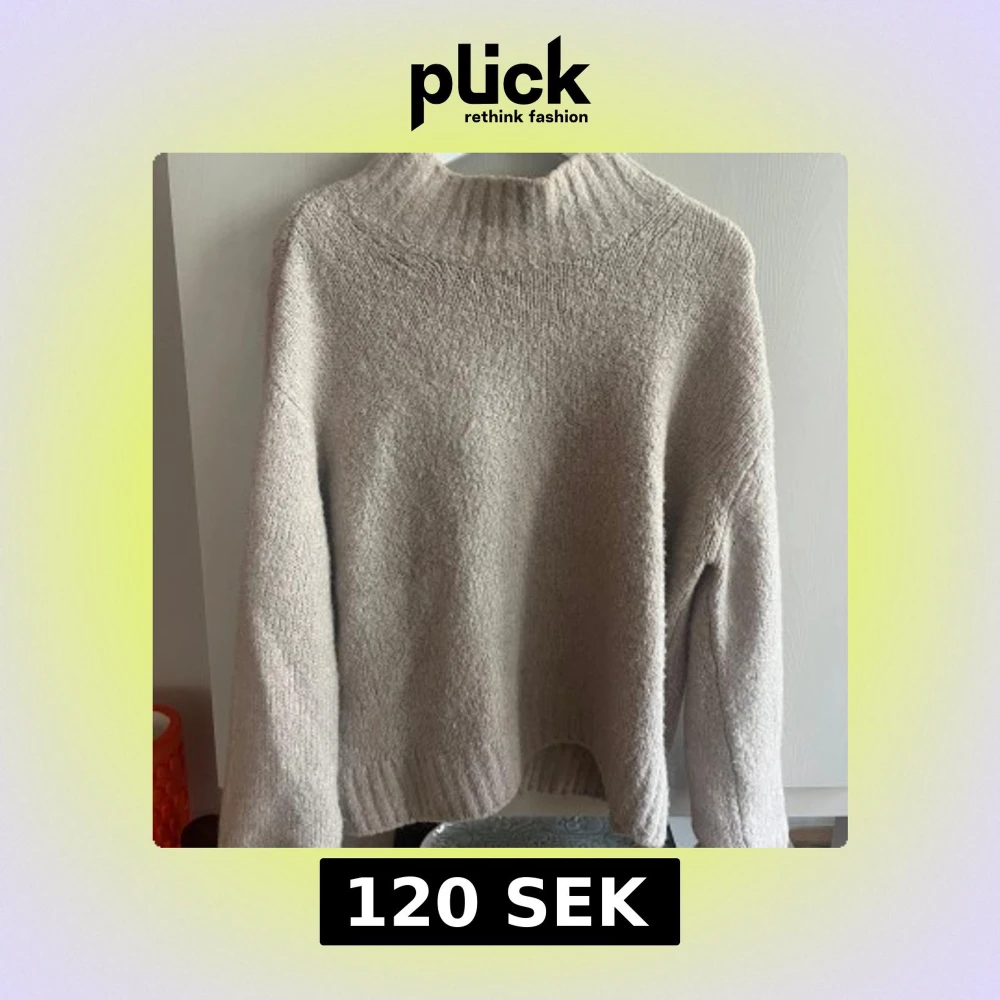 Mysig beige stickad tröja med hög krage och långa ärmar. Perfekt för kyliga dagar med sin mjuka och varma känsla. Ribbstickade detaljer vid krage och ärmslut ger en stilren look.