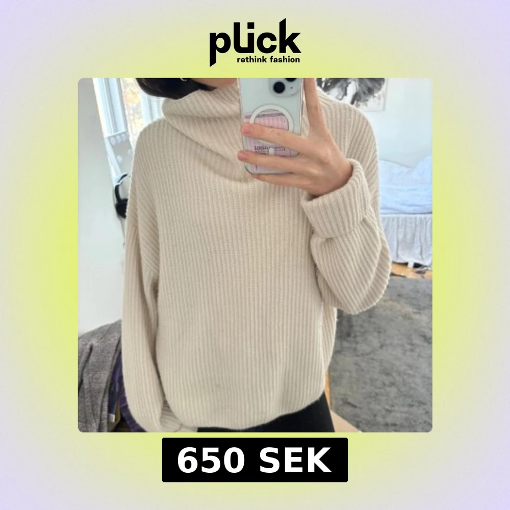Mysig beige stickad tröja med ribbad struktur och hög krage. Hög krage turtelneck polotröja i kashmir blandning från hm