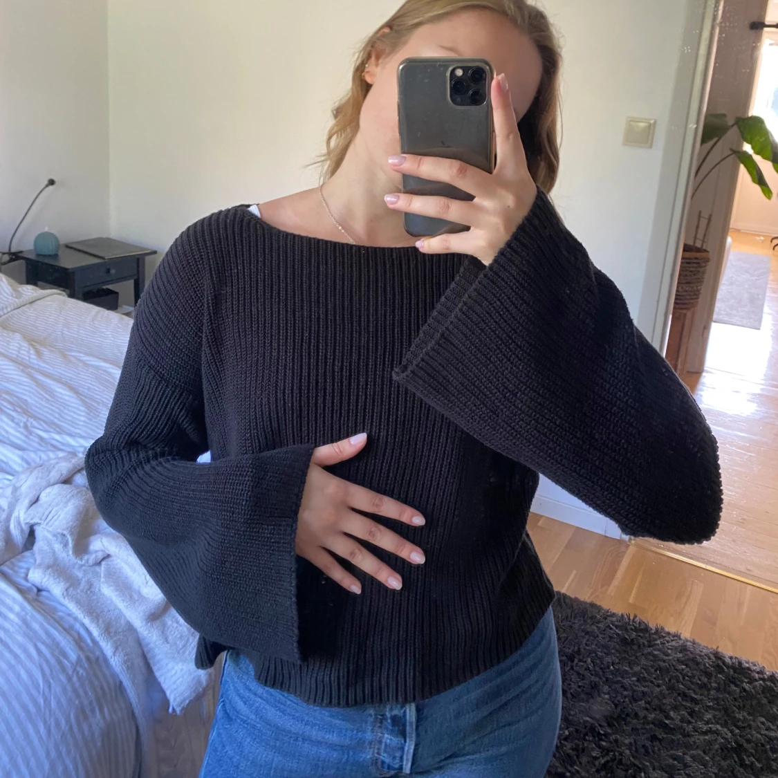 Säljer en svart stickad tröja med vida ärmar. Riktigt snygg basic tröja med den lilla extra detaljen🖤 Strl XXS men skulle säga att den mer är som S🖤