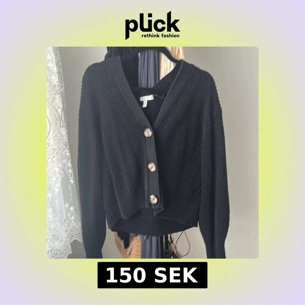 Svart stickad kofta från H&M i storlek S. Koftan har grov ribbstickning, v-ringning och stora, snygga knappar framtill. Perfekt att slänga över en t-shirt eller klänning för en chill look.
