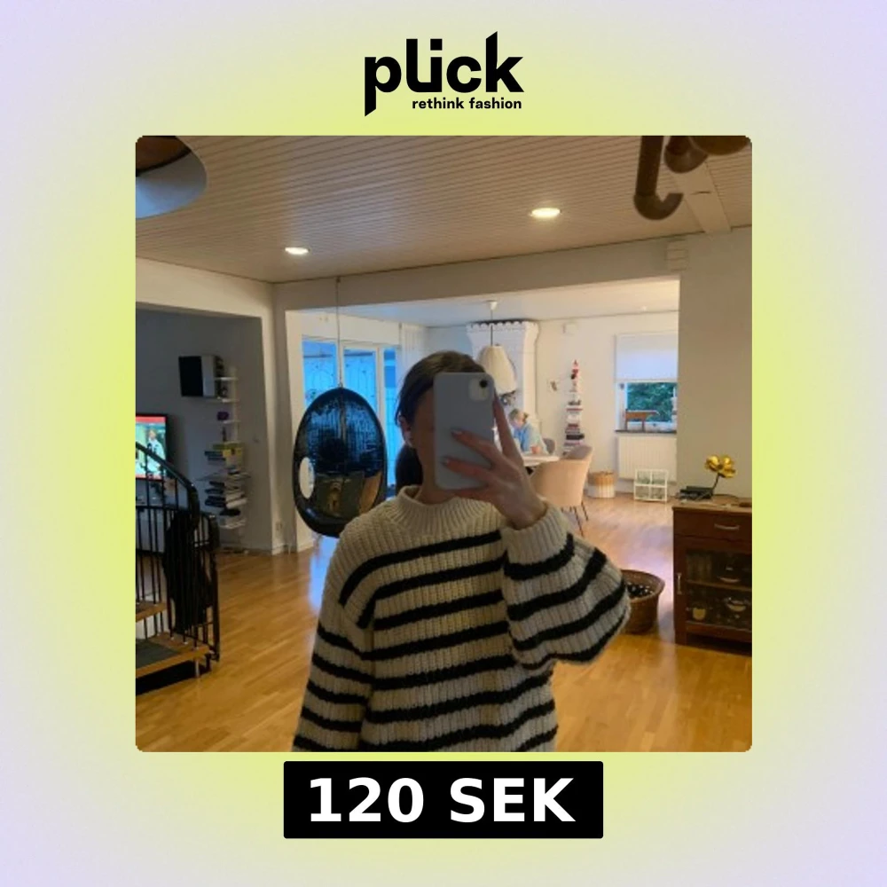 Säljer en chunky stickad tröja med breda svarta och vita ränder. Tröjan har oversized passform, nedhasade axlar och breda muddar vid ärmslut och nederkant. Perfekt för dig som gillar en avslappnad och trendig look.