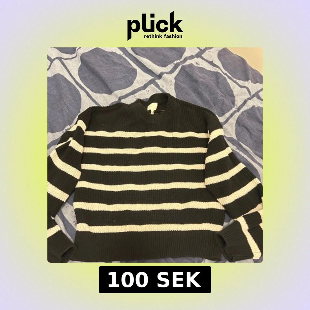 Säljer en svart och vit randig stickad tröja från H&M i storlek S. Tröjan har en klassisk rund halsringning och långa ärmar. Perfekt för dig som gillar en chill och stilren look med lite edge.