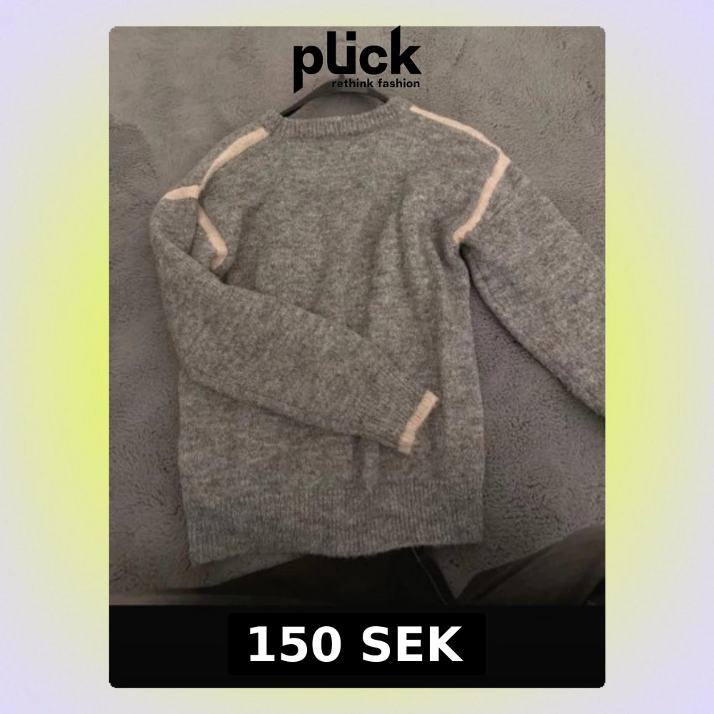 Mysig grå stickad tröja med ljusrosa ränder längs axlar och ärmslut. Tröjan har rund halsringning, långa ärmar. Perfekt för kalla dagar och enkel att matcha med olika outfits.